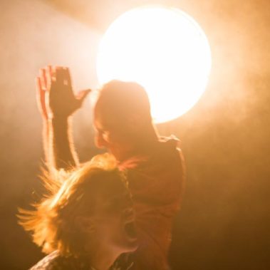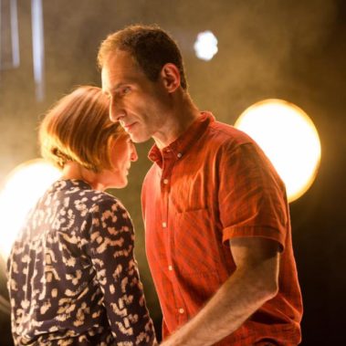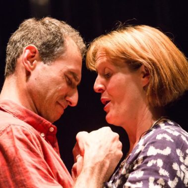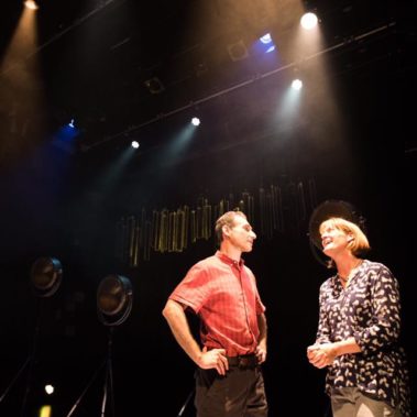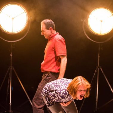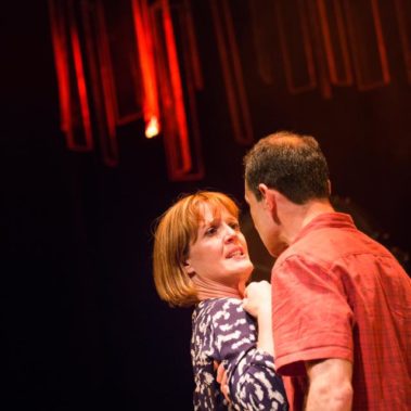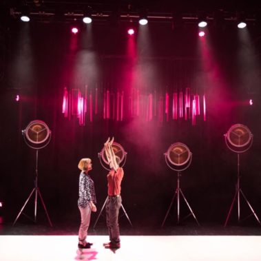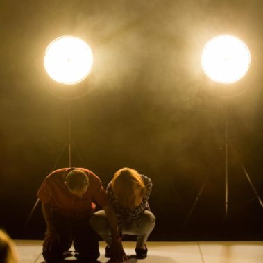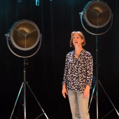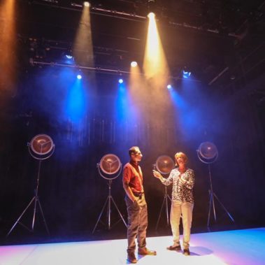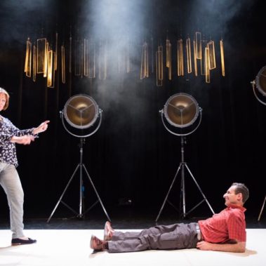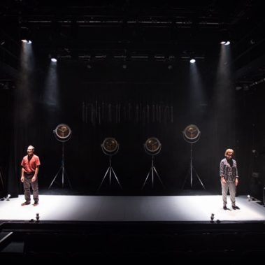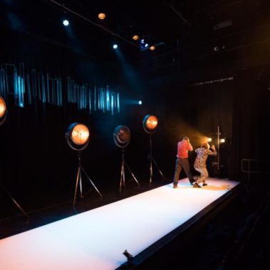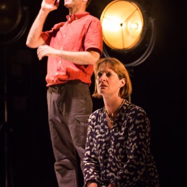 ” Four imposing lights directly face the audience (in another life they shared a stage with Take That), acting both as sentinels and inquisitors. Jane Lalljee’s lighting design is simple but effective, made more powerful by the execution of exquisitely timed transitions…Squares of light precisely illuminate the action, one parallel world after the other, travelling from stage right to left.”