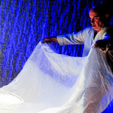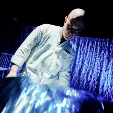 My instinct was that the colour palette had to be blue, so I searched for blues that would not be too cold. I use a couple of turquoise gels in the show, which warms the whole thing up. I also use some strawey/amber light from the front which also helps to make it cosy and inviting.