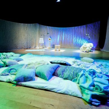 The whole space is an installation that has lots of things for the audience to look at as soon as they enter. I had to light the whole space and make it look cosy and inviting, which I think worked pretty well. I then use the same colours for the installation and for the lights where the audience sit, and once again mirror the same colours on stage. Hopefully, there is a cohesion within the lighting that balances the whole space.